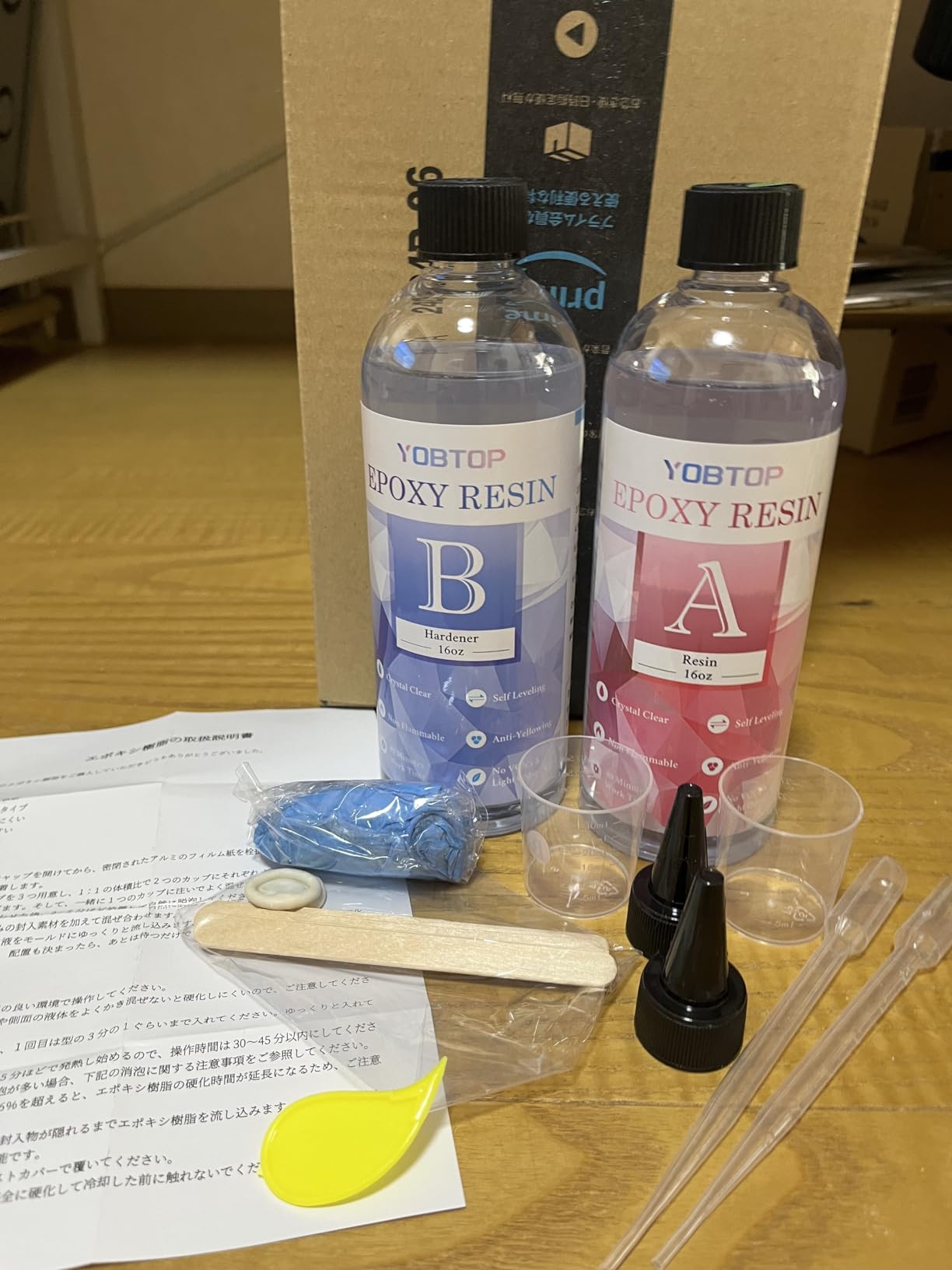 【レジン液大容量】高品質YOBTOPニ液性レジン液、大容量(474ml+474ml)、コスパが高いです。エポキシ樹脂はA(樹脂)とB(硬化剤)で構成され、混合比は1:1です。ライトを使わないので大きな作品を作るときに最適です。15~25度の環境下で24時間から48時間で硬化します。